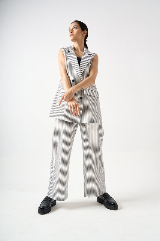 STRIPPED SLEEVELESS BLAZER WITH FRONT BUTTONS AND POCKET DETAILS WITH PANTS
