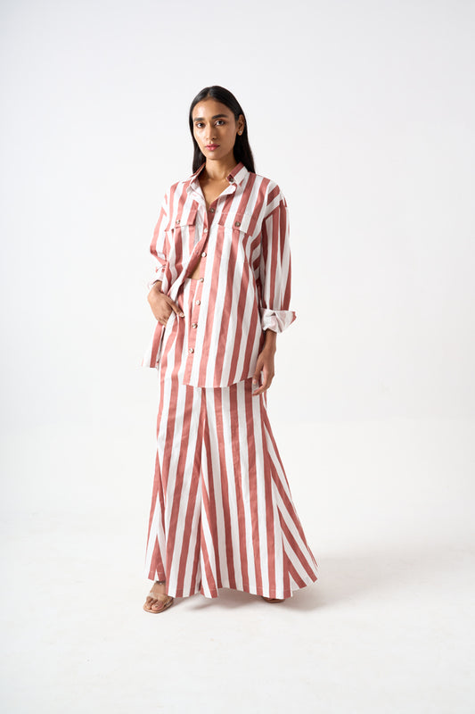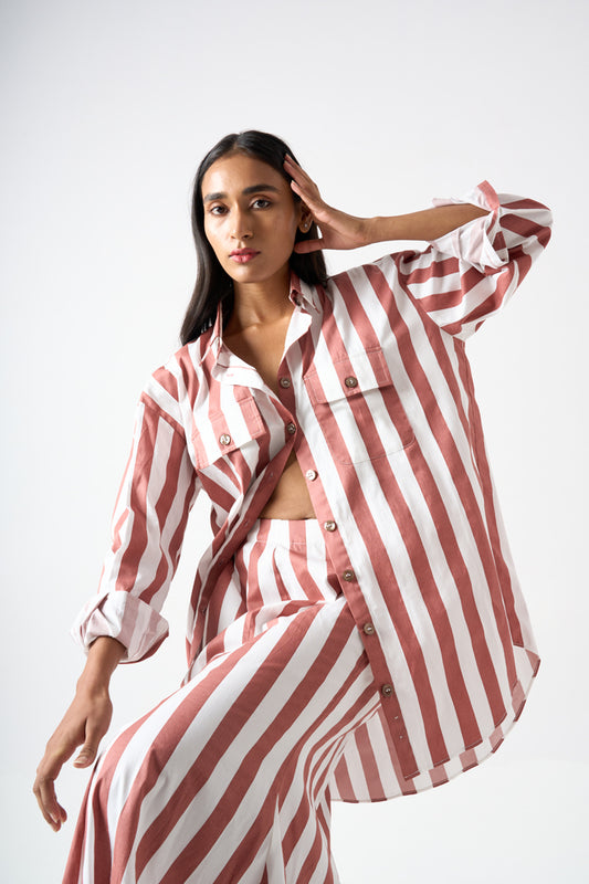 STRIPPED COLLARED OVERSIZED SHIRT WITH FULL SLEEVES AND PATCH POCKET DETAILS