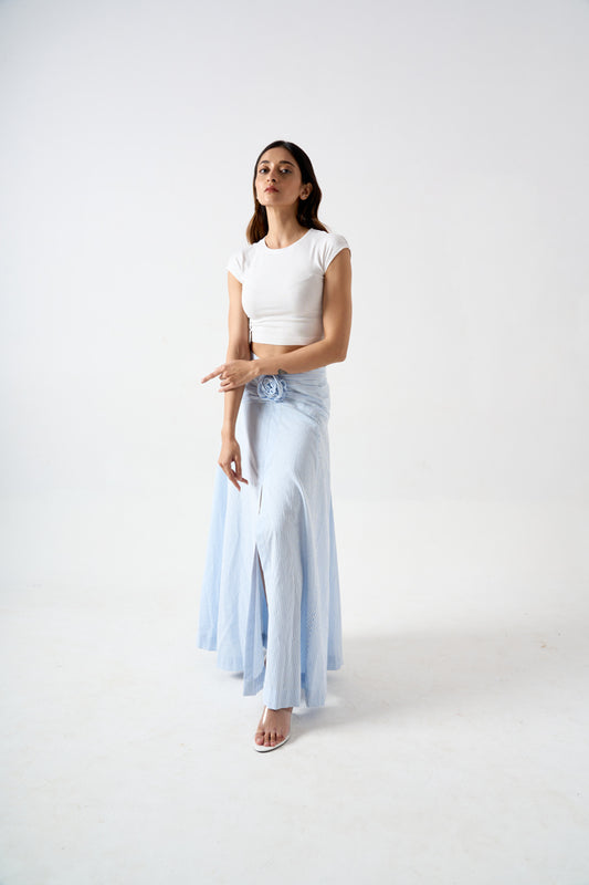 STRIPPED FULL LENGTH SKIRT WITH FRONT SLIT AND APPLIQUE FLOWER DETAIL