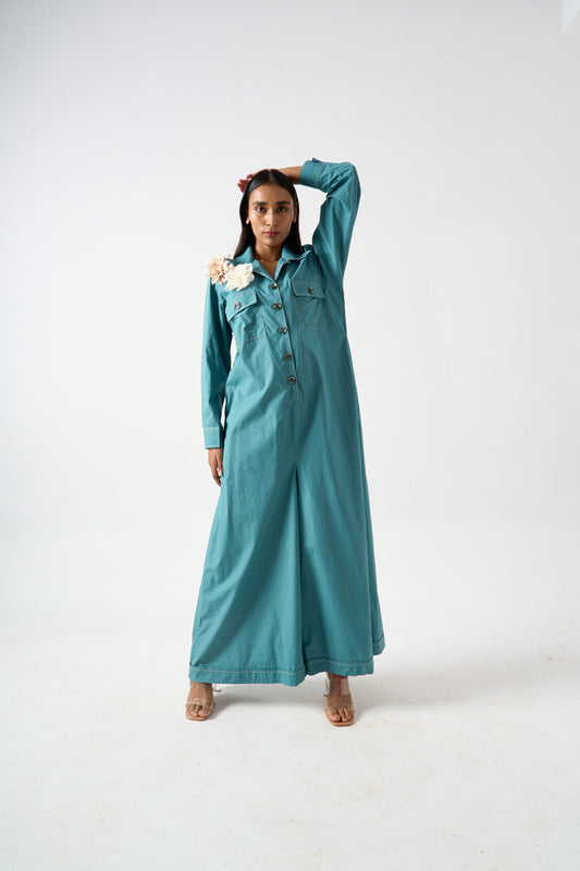 COLLARED FULL LENGTH FULL SLEEVES JUMPSUIT WITH FRONT BUTTON AND PATCH POCKET DETAILS