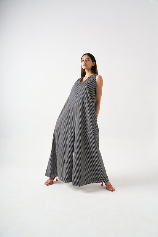 STRIPPED SLEEVELESS V-NECK JUMPSUIT WITH SIDE POCKET AND BACK ZIP FASTENER