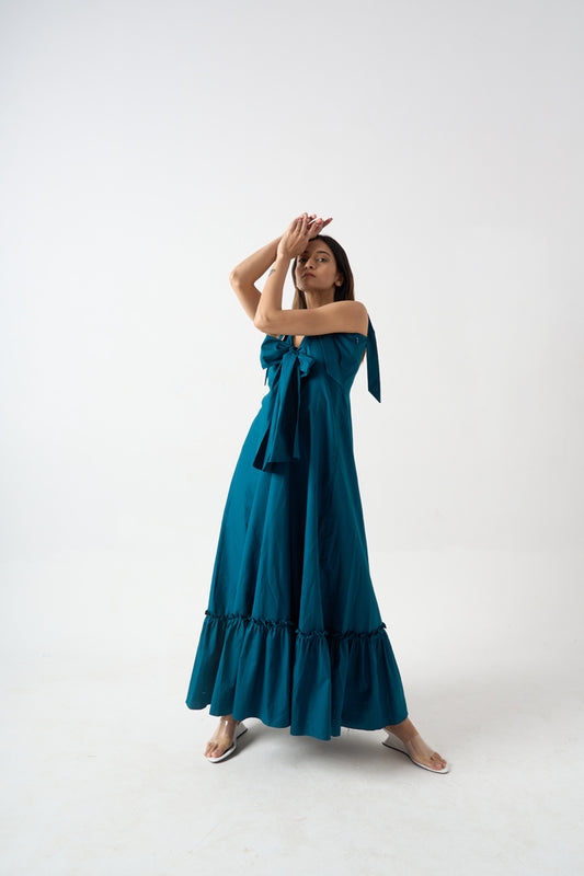 MAXI LENGTH FLARED DRESS WITH SHOULDER AND FRONT TIE-UPS