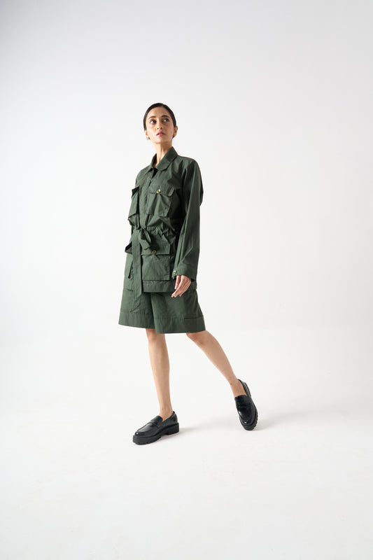 CHINESE COLLAR FULL SLEEVES BLAZER WITH FRONT BUTTON AND POCKET DETAILS AND WAIST TIE-UP WITH KNEE LENGTH SHORTS