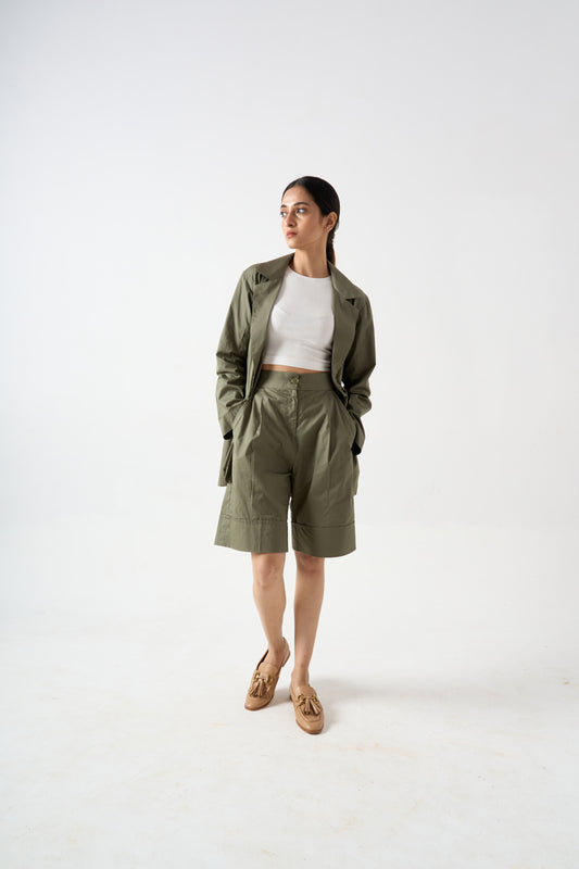 FULL SLEEVES BLAZER WITH FRONT BUTTON AND POCKET DETAILS WITH KNEE LENGTH SHORTS