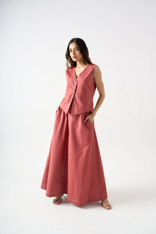 WAIST COAT WITH FRONT BUTTONS AND POCKET DETAILS WITH A-LINE SKIRT WITH SIDE POCKETS AND BACK WAIST ELASTIC