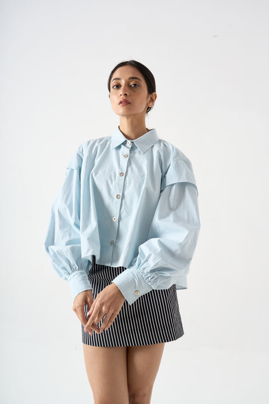 PINSTRIPED SHORT FLARED FULL SLEEVES TOP WITH COLLAR AND FRONT BUTTONS