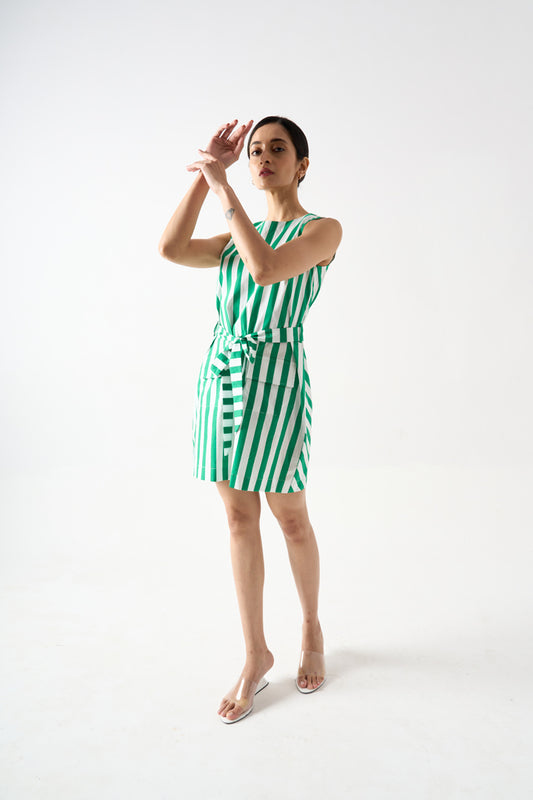STRIPPED SHORT SLEEVELSS DRESS WITH TIE-UP BELT AND PATCH POCKET DETAILS AND BACK ZIP FASTENER