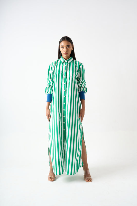 STRIPPED LONG SHIRT DRESS WITH COLLAR AND SIDE SLIT WITH CONTRAST RIBBED DETAILS ON THE SLEEVES