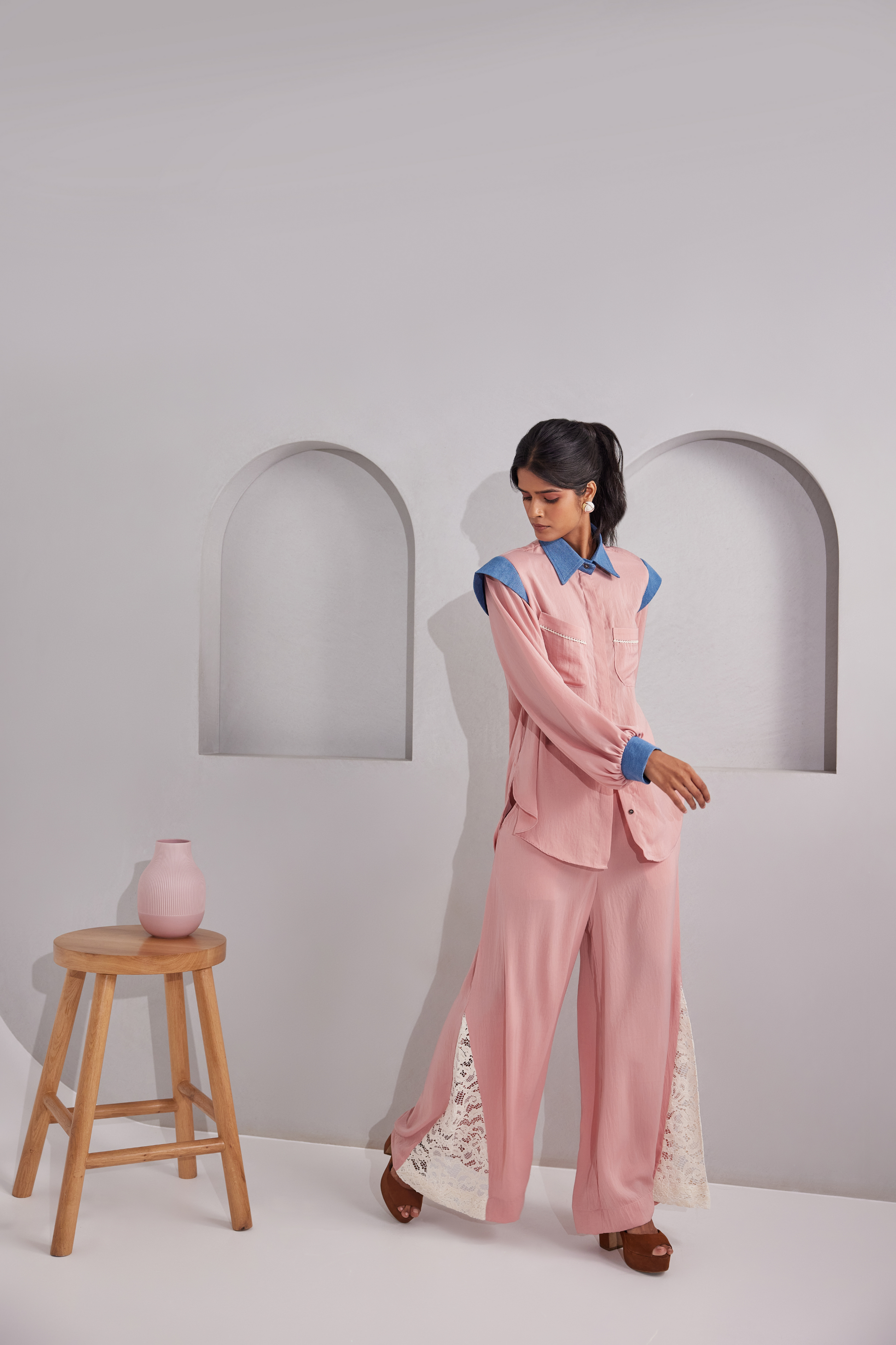 Front button closure, Denim collared shirt with 2 pockets on front, Padded shoulders with denims and balloon sleeves. White net design at the back. Flared pants with netted patches on side bottoms