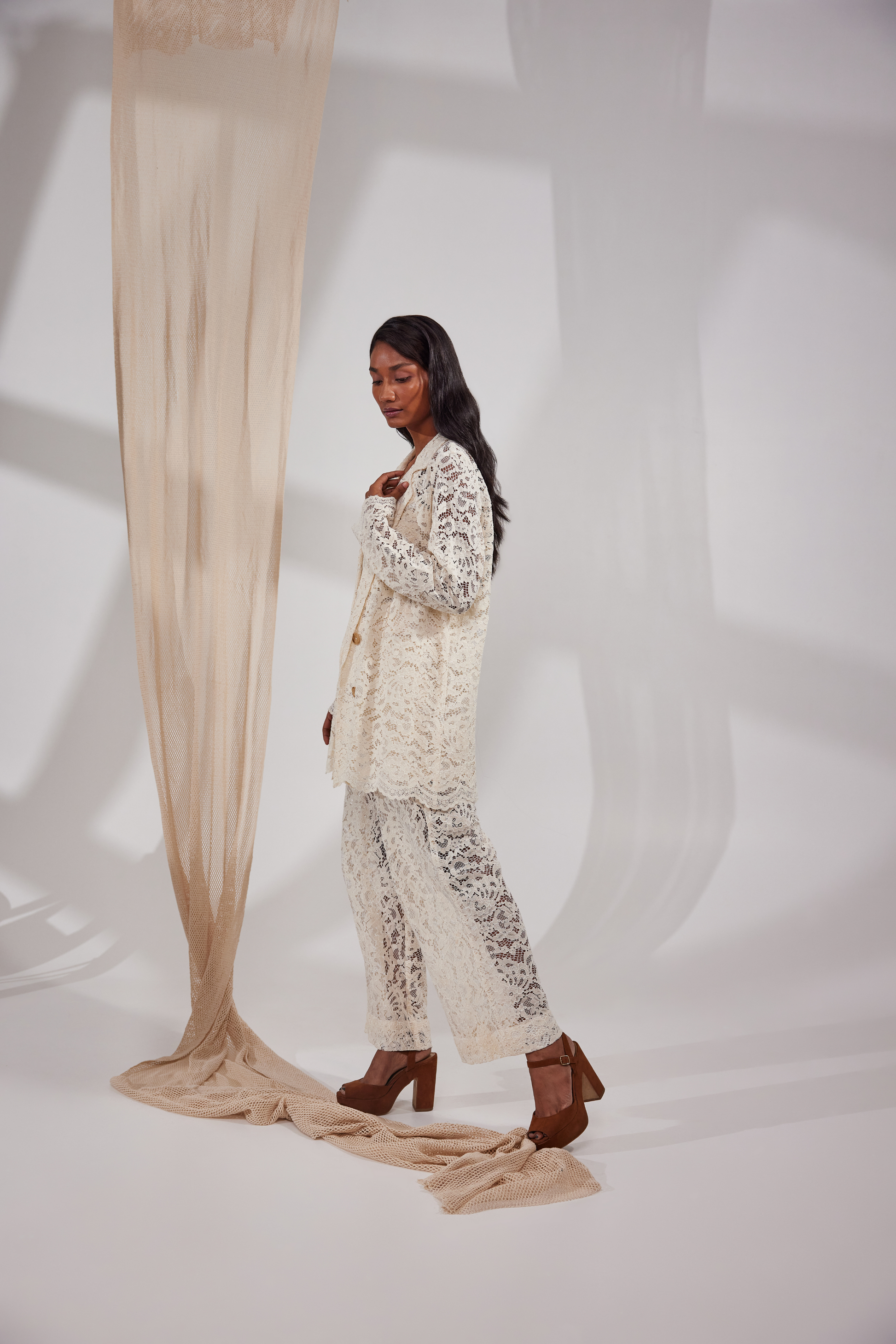Netted sleeveless top and pants with full sleeves blazer